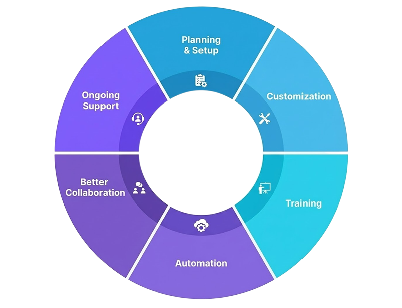 We make sure that Zoho fits your specific business goals so that teams can automate tasks, work together better, and grow in a way that lasts.