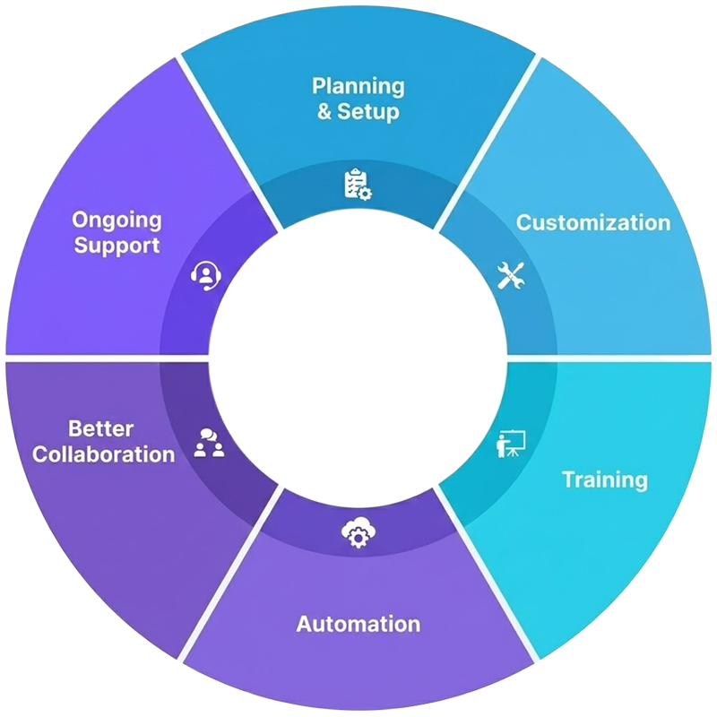 Whether you want a subscription, full installation, partial improvements, or custom changes, our experts have the right tools to help you with your whole journey. This includes adding additional modules, blueprints, workflow rules, approval hierarchies, and advanced analytics.